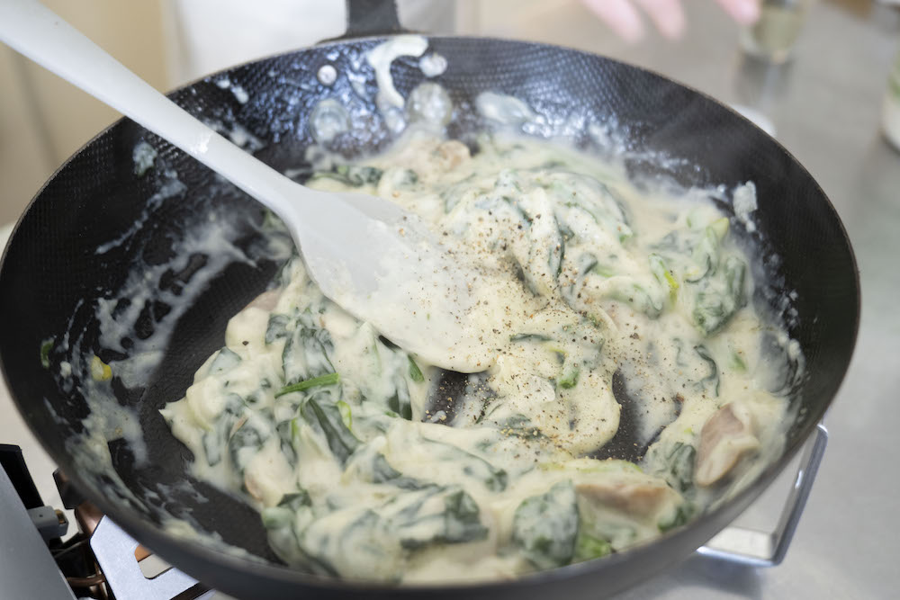 バターと油がじゅわっとしてきたら玉ねぎとソーセージを入れ焦げないよう弱火で炒め、ほうれん草を加えます。 |